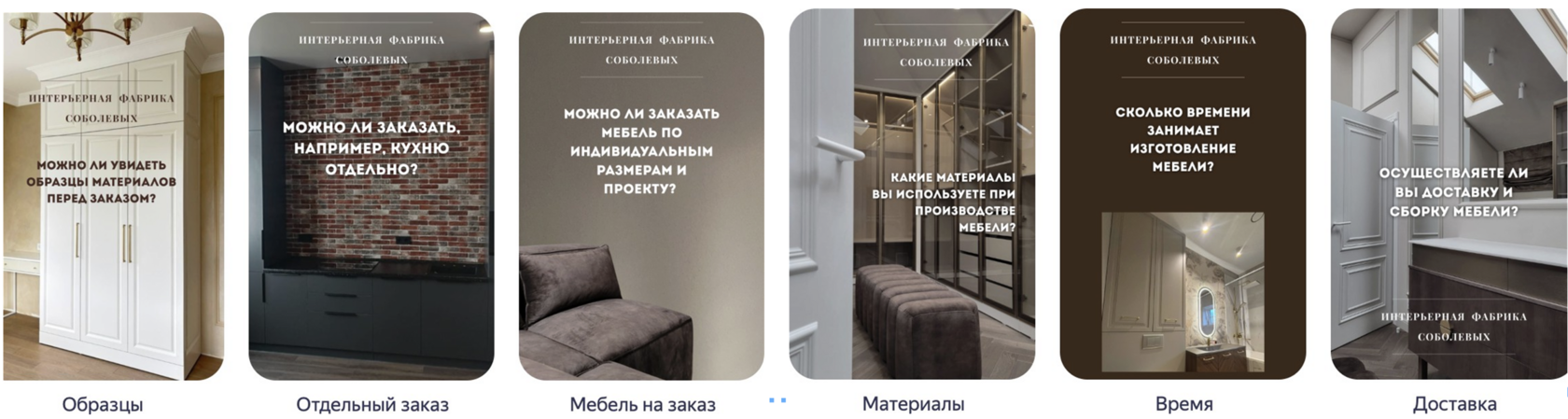 - Проработали дизайн сторис, прописали по пунктам почему должны выбирать именно эту интерьерную фабрику