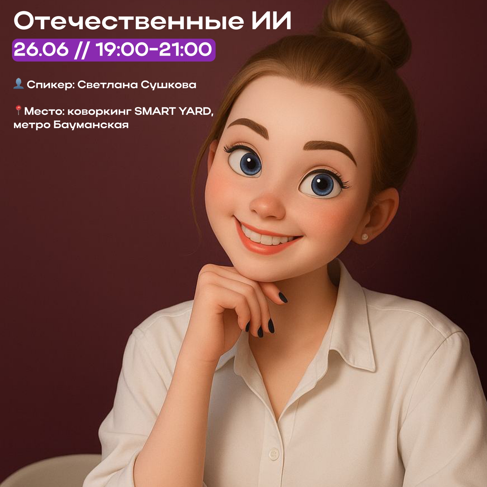 Спикер — Светлана Сушкова, предприниматель и гендиректор агентства CopySpace. Опыт — 8 лет в маркетинге, десятки запущенных проектов и реальная практика работы с ИИ.